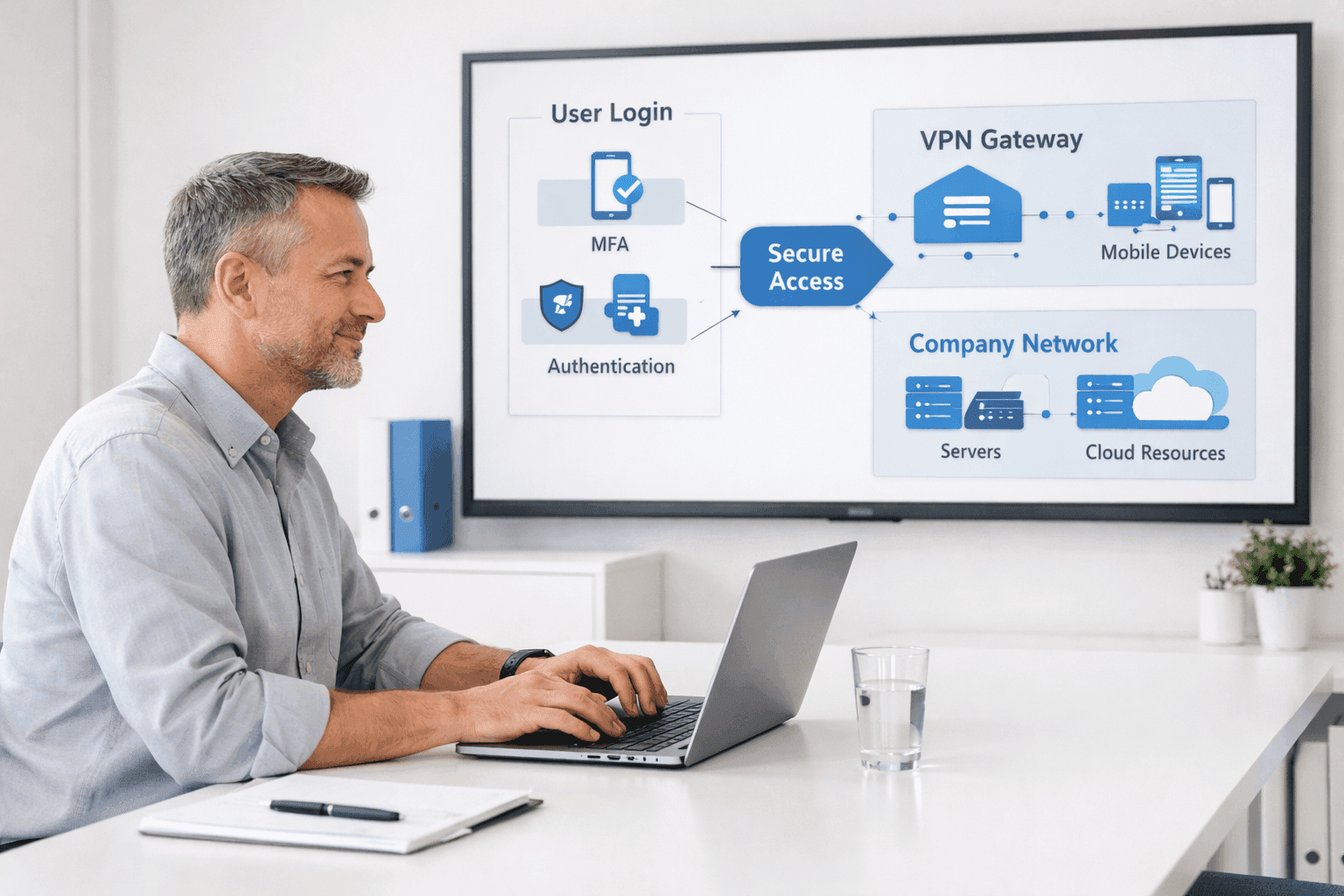 Ein Beratungsunternehmen mit mehreren Standorten benötigte eine sichere und zugleich flexible Remote-Arbeitsstruktur. Durch die Einführung von Multi-Faktor-Authentifizierung, verschlüsselten VPN-Zugängen und klaren Zugriffskonzepten wurde die Angriffsfläche signifikant reduziert, ohne die Produktivität der Mitarbeitenden einzuschränken.
