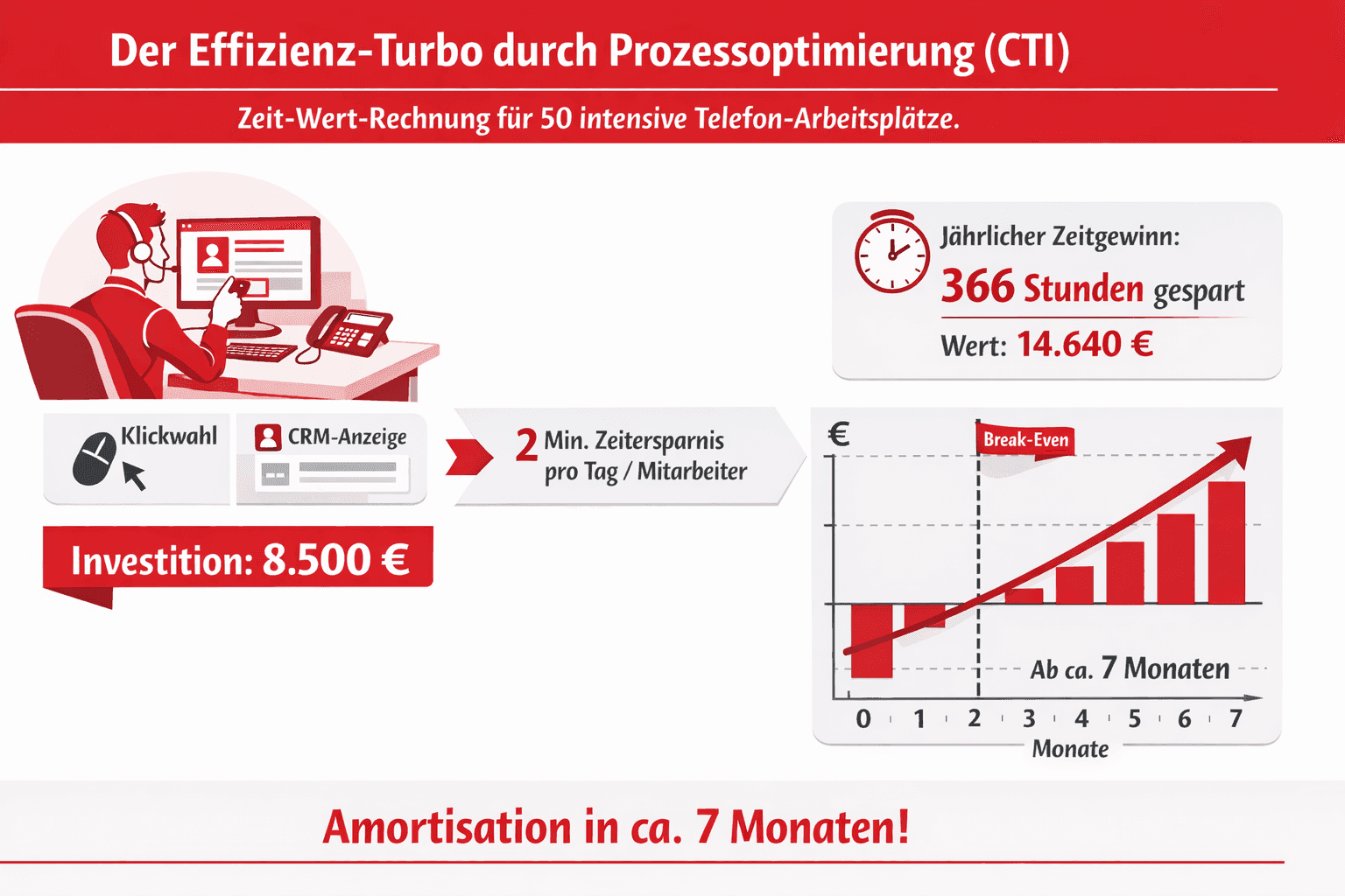Schnellere Fallbearbeitung: Durch die KI-gestützte Vorqualifizierung und Identifizierung von Anrufern sparen Mitarbeiter pro Gespräch etwa 15 bis 30 Sekunden Suchzeit, da relevante Daten aus CRM- oder ERP-Systemen sofort bereitstehen.