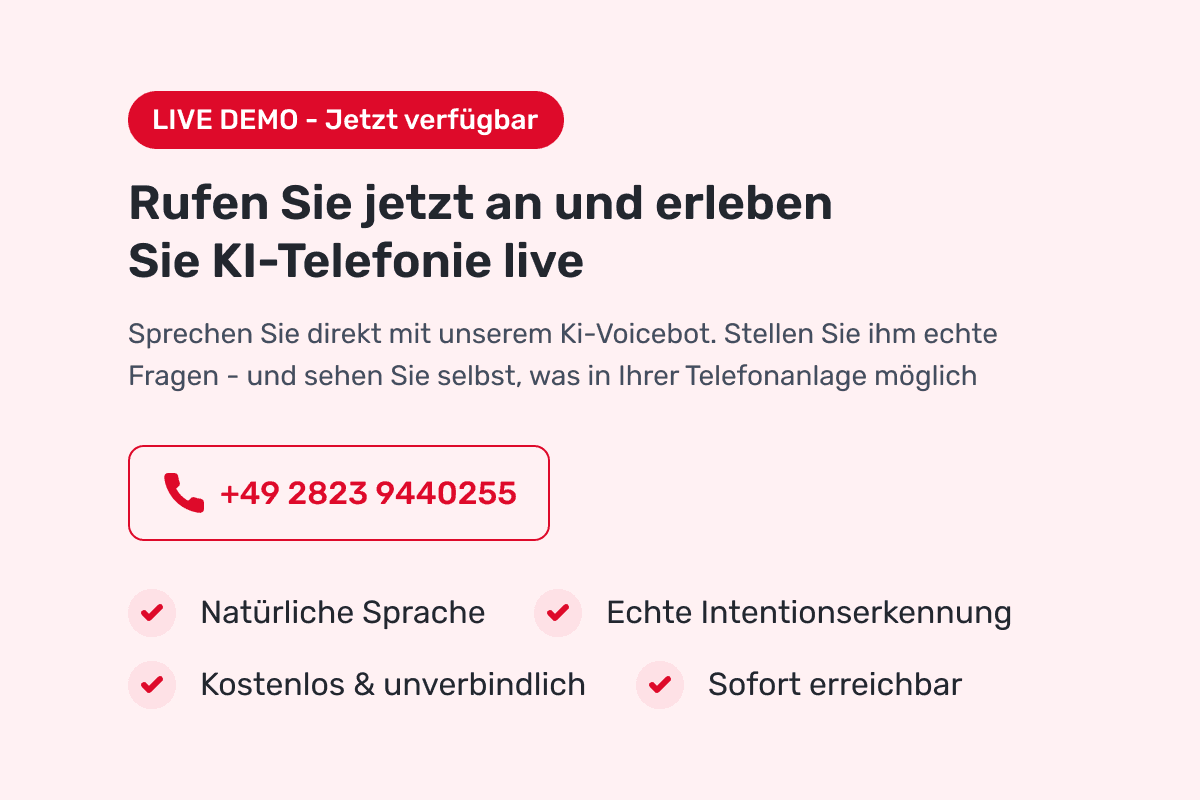 Tiefenintegration statt isolierter Insellösungen. Wir betrachten KI als Hebel für Ihre Prozessoptimierung. Unser Alleinstellungsmerkmal ist die Verbindung von moderner Automatisierung mit Ihrer Telefonie:
