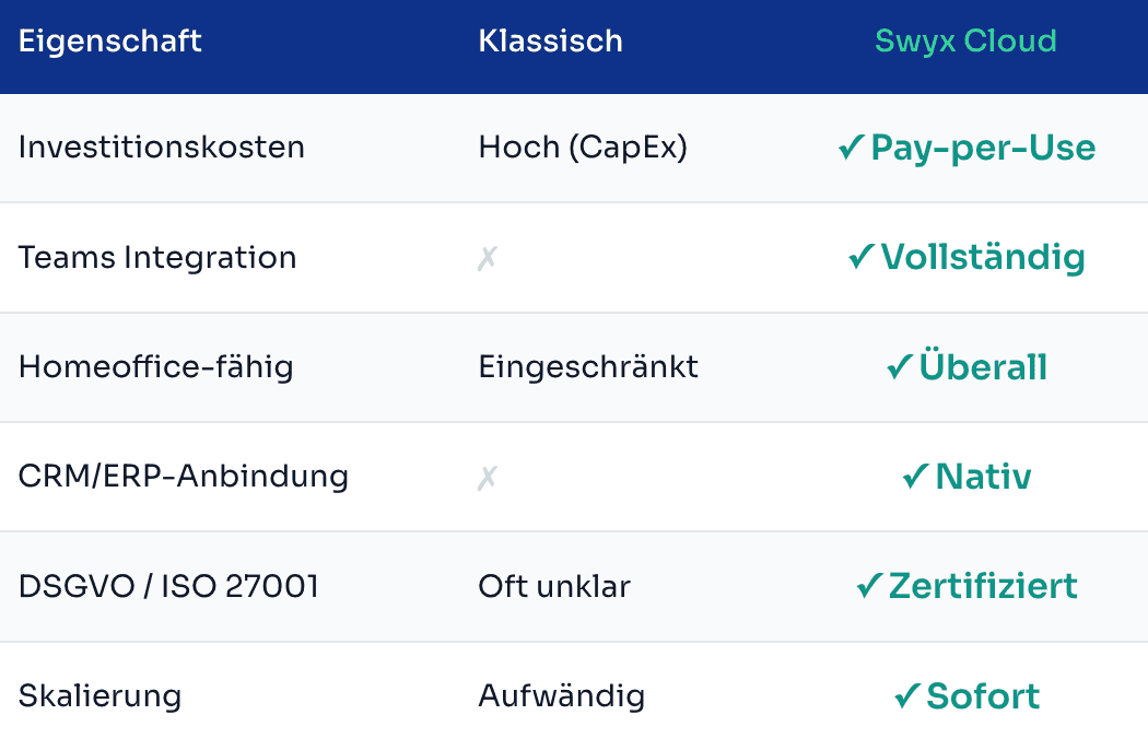 Klassische TK-Anlagen verursachen hohe Einmalkosten (CapEx), Wartungsaufwände und blockieren die Flexibilität Ihres Teams. Cloud-Telefonie mit Swyx dreht dieses Modell um.